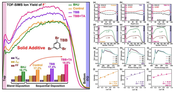 我院薄膜光伏团队与韩国浦项科技大学Kilwon Cho教授等人利用具有高挥发性和低成本的1, 3, 5-三溴苯(TBB)作为受体溶液中的固体添加剂,并采用顺序沉积方法制备有机太阳能电池(Organic Solar Cells,简称OSCs)的光活性层,再结合热退火(TA)来调节由D18-Cl/L8-BO组成的OSCs光活性层中的垂直相分布。研究通过加入添加剂TBB,再结合热处理,在薄膜中形成长距离的分子填充和均匀的“双连续给体-受体”网络,从而提高薄膜的结晶度和在垂直方向上有利的供体-受体分布。研究中"TBB+TA"处理过的OSCs实现了18.5%(平均18.1%)的光电转换效率,VOC为910 mV,JSC为26.3 mA cm-2,FF为77.2%,优于其控制器件(17.2%,平均16.7%的光电转换效率)。器件性能的提高与激子生成速率、电荷载流子迁移率、电荷载流子寿命的增加以及双分子电荷重组的减少有关。该工作将先进的器件性能归因于垂直方向上梯度分布的给体-受体浓度,为优化顺序沉积的顶层形态以实现高性能有机太阳能电池提供了思路。