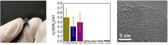 我院纳米能源研究中心邓承浩课题组硕士生赵斯麒等人制备了基于单根碳纳米线圈的柔性湿度传感器件,针对其响应机理、湿度响应调控,以实现独立的温湿度微纳传感器件为目标,开展了系统研究。研究发现,由于独特的弹簧结构,单根碳纳米线圈在较大的应变范围内可以保持其温湿度响应不变。通过氨水处理的单根碳纳米线圈,其湿度响应受到了极大的抑制,在20%至90%的湿度范围内,其电阻几乎保持不变,但其温度响应并未受到明显影响。经过X射线光电子能谱、红外光谱和能量色散谱分析及电导率统计发现,氨水处理在碳纳米线圈中引入了非挥发的饱和水分子,这些水分子经由多晶-非晶混合结构中存在大量的空位渗入碳纳米线圈。