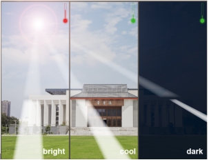 建筑能耗占社会一次能源消耗的30%,且这一比值正在逐渐增加。窗户作为建筑室内外能量交换的主要载体,是建筑智能节能化中不能忽视的重要一环。传统透明玻璃窗户和窗帘等光热调节装置,因其自身局限性已不能满足当今人们的对照明和制冷/暖的双重动态管理要求。双波段电致变色智能窗(DESW)是近年来发展起来的新型节能窗户,其可以选择性的独立控制太阳光中的近红外热和可见光光的透射率,有望大幅度提高建筑能效。近日,作者们展示了一种基于溶胶-凝胶法的策略,使用发泡剂合成多孔掺钛氧化钨膜,用于构建高性能DESW器件。所制备的薄膜显示出良好的双波段电致变色性能,包括高光学调制、高着色效率、良好的双稳态和循环稳定性。同时,作者通过红外热成像技术证明了该器件可以有效调节入射到室内太阳光中的可见光和热量。