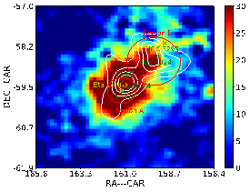 有证据表明年轻的巨星团可能是银河系内高能宇宙线起源之一。我院硕士研究生葛婷婷和导师孙晓娜与中国科技大学杨睿智教授等合作,基于Fermi卫星的高能粒子探测器LAT最新的观测数据,研究船底座星云复合体中大质量星团Tr 14和Tr 16周围GeV伽马射线辐射,发现这个区域存在扩散的GeV伽马射线辐射,其空间分布与分子气体一致,用两个高斯盘的空间模型可以很好地解释。两个区域的伽马射线能谱分布均可用轻子和强子两种模型去拟合。区域A的谱较软且显示了一个明显的pion-bump特征,可能是由于A区的双星系统过亮引起,或是双星系统加速的软宇宙线和气体相互作用导致,但也不排除双星系统和大质量星团共同加速宇宙线的情况。B区的高气体密度和伽马射线辐射与分子气体之间较好有空间一致性,其伽玛射线辐射可能起源于强子辐射。两个区域的宇宙线径向分布不符合1/r的关系,可能由于该系统中的宇宙线是来自最近的一些脉冲过程,而不是持续注入的。