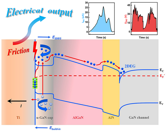 由于对可再生能源的迫切需求,引起人们对摩擦纳米发电机(TENGs)作为一种新型能源技术的极大兴趣。与传统的聚合物摩擦发电机相比,半导体直流摩擦发电机更适用于小型集成化电子器件的发展需求。本研究提出了一种由耗尽模式氮化镓高电子迁移率晶体管(D-mode GaN HEMTs)制成的摩擦材料,该材料具有高二维电子气(2DEG)浓度等优越的性能。通过在D-mode GaN HEMT上滑动金属钛片,我们设计了一种金属-半导体直流摩擦电纳米发电机(MSDC TENG),其电压可达45.5V,峰值功率密度为2.32 W/m2。该发电机可用于为14个串联LED提供直流电源,也可以直接驱动电子手表。值得注意的是,GaN-based HEMT TENG直流电的形成主要是受u-GaN cap表面态所产生的大量电子的影响,并且与u-GaN/AlGaN/AlN/GaN异质结构中二维电子气方向上的额外电场有关。该研究成果在摩擦能量收集方面具有潜在的应用前景。