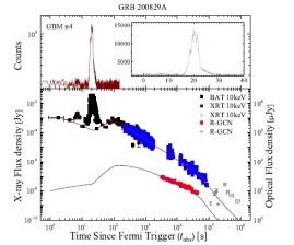 GRB 200829A是一个特殊的伽马暴,其首先被Fermi-GBM和Swift-BAT/XRT探测到,继而被其它望远镜快速跟踪观测。博士生李静与导师等人对这个暴进行了详细的分析,发现GRB 200829A的瞬时辐射由一个明亮尖锐的伽玛射线脉冲主导,极早期存在一个弱的伽玛射线辐射成分,而且能谱分析显示明亮尖锐脉冲存在双辐射成分,可以用Band函数加上黑体辐射谱拟合。基于其中的黑体辐射成分,他们研究了相应喷流的光球层性质,发现火球初始半径取为109cm时光球层为中等磁化,这暗示了脉冲中的Band谱辐射成分可能源于磁能耗散。极早期瞬时辐射可以用一个能谱指数约为-1.7的幂律能谱函数进行拟合,这样的能谱与外激波余辉的能谱极像,且与该暴的晚期X射线余辉能谱谱指数一致。鉴于此,他们认为该暴极早期瞬时辐射可能起源于外激波;明亮尖锐脉冲则反映了中心引擎的再次活动,并通过注入能量到早先形成的外激波,从而形成100秒左右的X射线余辉鼓包。基于这样的模型,通过MCMC方法,拟合了GRB 200829A的光变曲线,结果显示极早期瞬时辐射、40秒之后的X余辉、光学余辉均能够用外激波辐射进行解释。