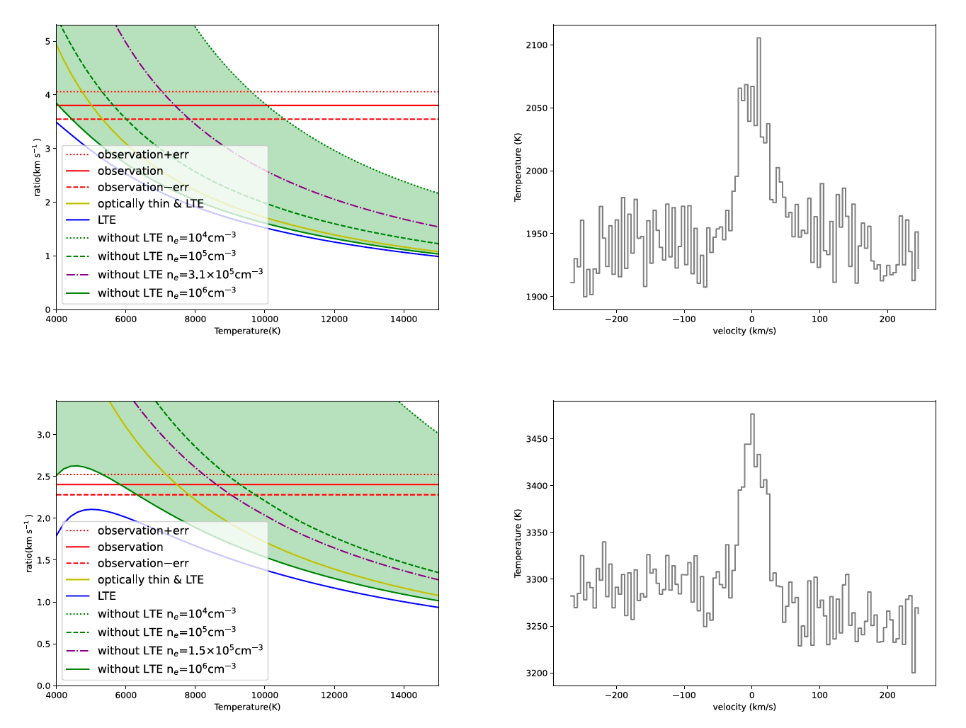 1. 非局部热动平衡条件下,左图为模拟和观测谱线与连续谱比值的关系(布居反转的明确证据);右图为对应的观测像素点包含连续谱的谱线。