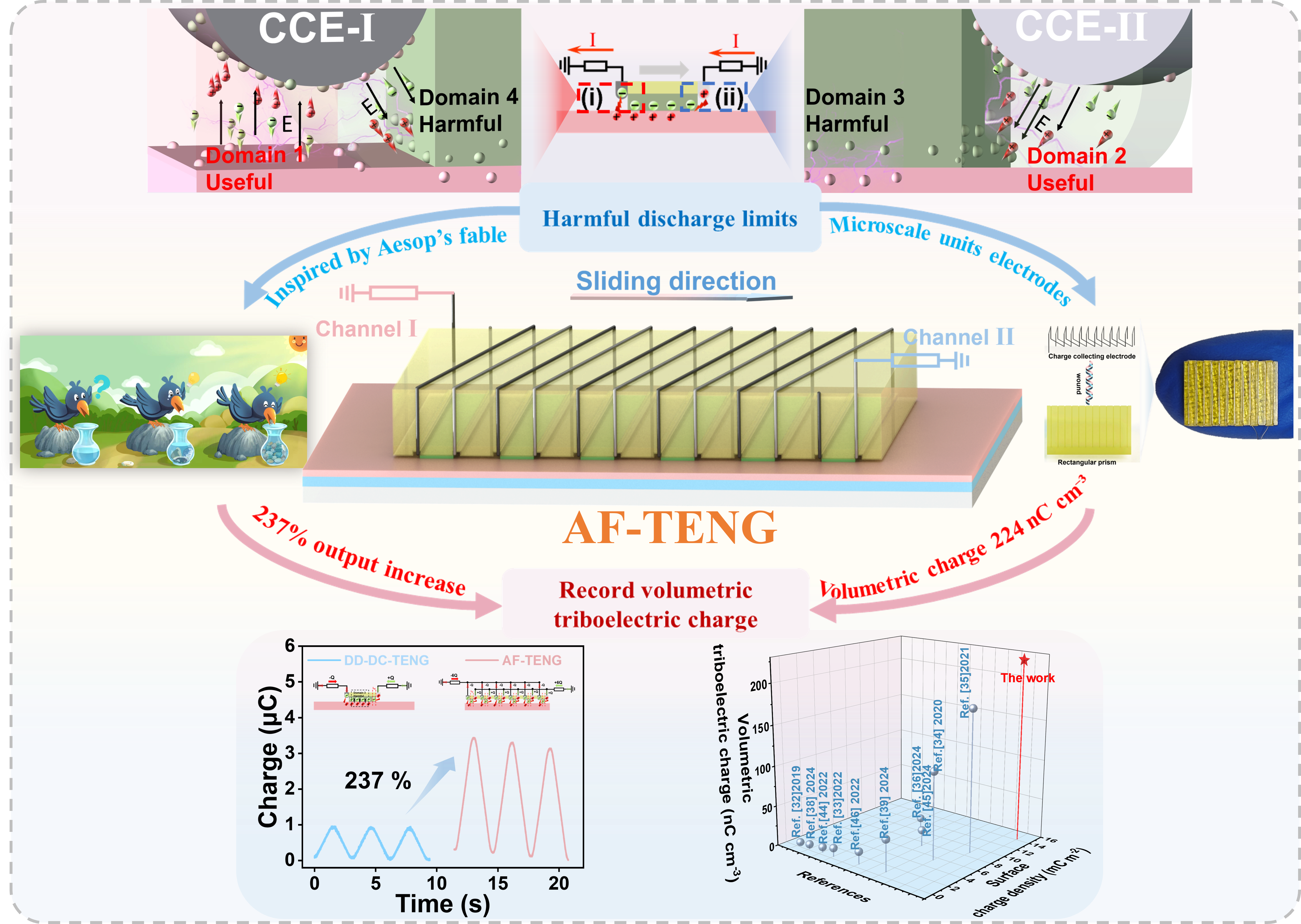 针对上述挑战,受《伊索寓言》中乌鸦喝水的故事启发,研究团队提出了一种基于电晕放电机制的高性能直流摩擦纳米发电机(AF-TENG),通过极致空间压缩策略实现顺畅的摩擦电荷释放。该器件在滑块内部集成高密度、双通道螺旋式电荷收集电极阵列,将原本集中于电极未覆盖区域的摩擦电荷划分为多个微尺度单元,实现快速、连续释放,使输出电荷量提升了237%。该结构借助投影微立体光刻(PμSL)技术实现高精度集成,并通过微沟槽引导不锈钢细丝有序排布,形成紧凑稳定的电荷收集结构,从而有效抑制有害放电与局部电荷堆积,提升了输出稳定性与一致性。在此基础上,研究首次提出输出摩擦电荷体密度(Volumetric Triboelectric Charge, C m⁻³)这一性能评价指标,将滑块长度、宽度和滑动距离统一纳入评价体系,从空间体积角度表征摩擦电荷的产生与传输效率。实验结果表明,该指标可有效消除器件几何尺寸对性能评价的影响,更公平地比较不同直流型TENG结构的内在性能。经理论与实验验证,AF-TENG在多项关键性能指标上实现突破,其表面电荷密度达14.2mC m⁻²,输出摩擦电荷体密度高达 224nC cm⁻³,双双刷新了直流型摩擦纳米发电机的最高纪录。即使在仅1.46 cm²的指甲盖大小的滑块下,该器件仍可稳定为温湿度计、计算器等低功耗电子器件供能。所提出的空间压缩策略具有可推广性,为直流型TENG的性能提升与统一评价提供依据,该研究在微能量收集、自供电传感系统和物联网电源解决方案中展现出应用潜力。